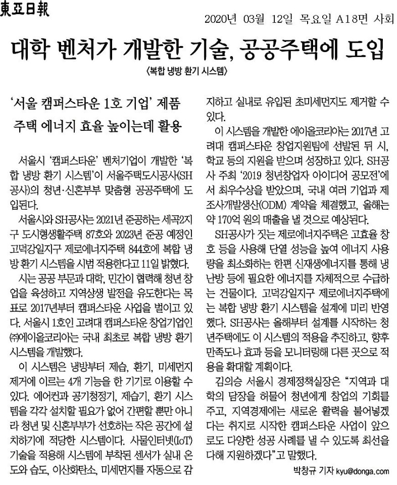 '서울 캠퍼스타운 1호 기업' 제품 주택 에너지 효율 높이는데 활용..