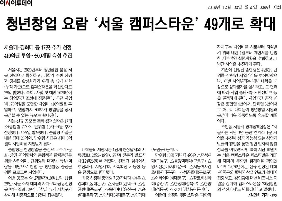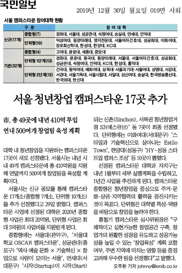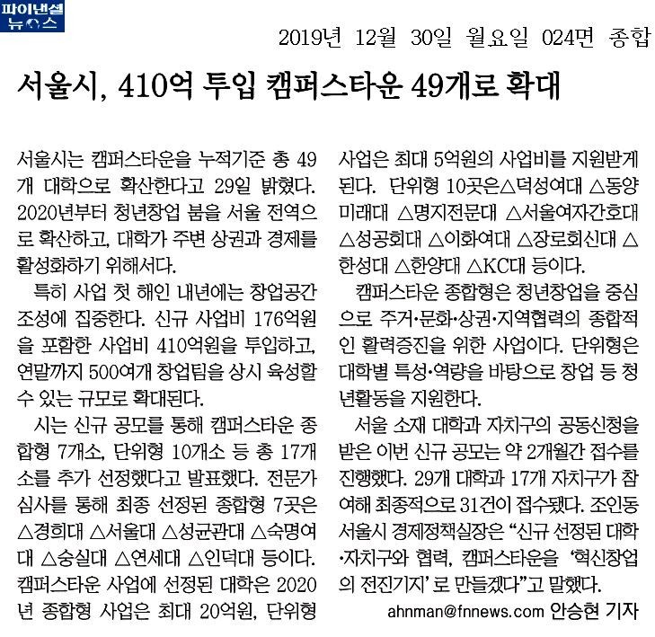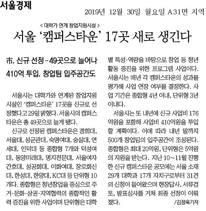서울시는 캠퍼스타운을 누적기준 총 49개 대학으로 확산한다고 29일 밝혔다..